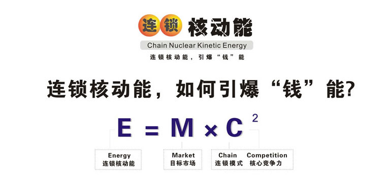 ,這是世界著名的愛因斯坦能量公式。基于愛因斯坦的相對論和能量公式,產(chǎn)生了原子彈和核電站,今天的人類太空實(shí)踐證實(shí)了愛因斯坦理論的正確性,人類因此發(fā)生了翻天覆地的變化。在愛因斯坦的能量公式中,M是質(zhì)量,C是光速,當(dāng)速度為光速時,即使很小的質(zhì)量也能轉(zhuǎn)化為非常大的能量。 廣州采納企業(yè)管理顧問有限公司首席咨詢師陳宏創(chuàng)建的的連鎖核動能理論(全名:連鎖內(nèi)核能量裂變激增理論)是以愛因斯坦的能量公式為基礎(chǔ)創(chuàng)建,但其含義和指向是不同的:M=目標(biāo)市場(Market),C1=連鎖模式(Chain),C2 =核心競爭力(Competition),其理論意義是,企業(yè)找準(zhǔn)了目標(biāo)市場,以連鎖的方式經(jīng)營,核心競爭力越大,推動其發(fā)展能量就越大。 連鎖核動能理論如何幫助連鎖企業(yè)“引爆錢能”快速發(fā)展?我們用深入淺出的圖形表達(dá)方式對該理論進(jìn)行分層闡述: